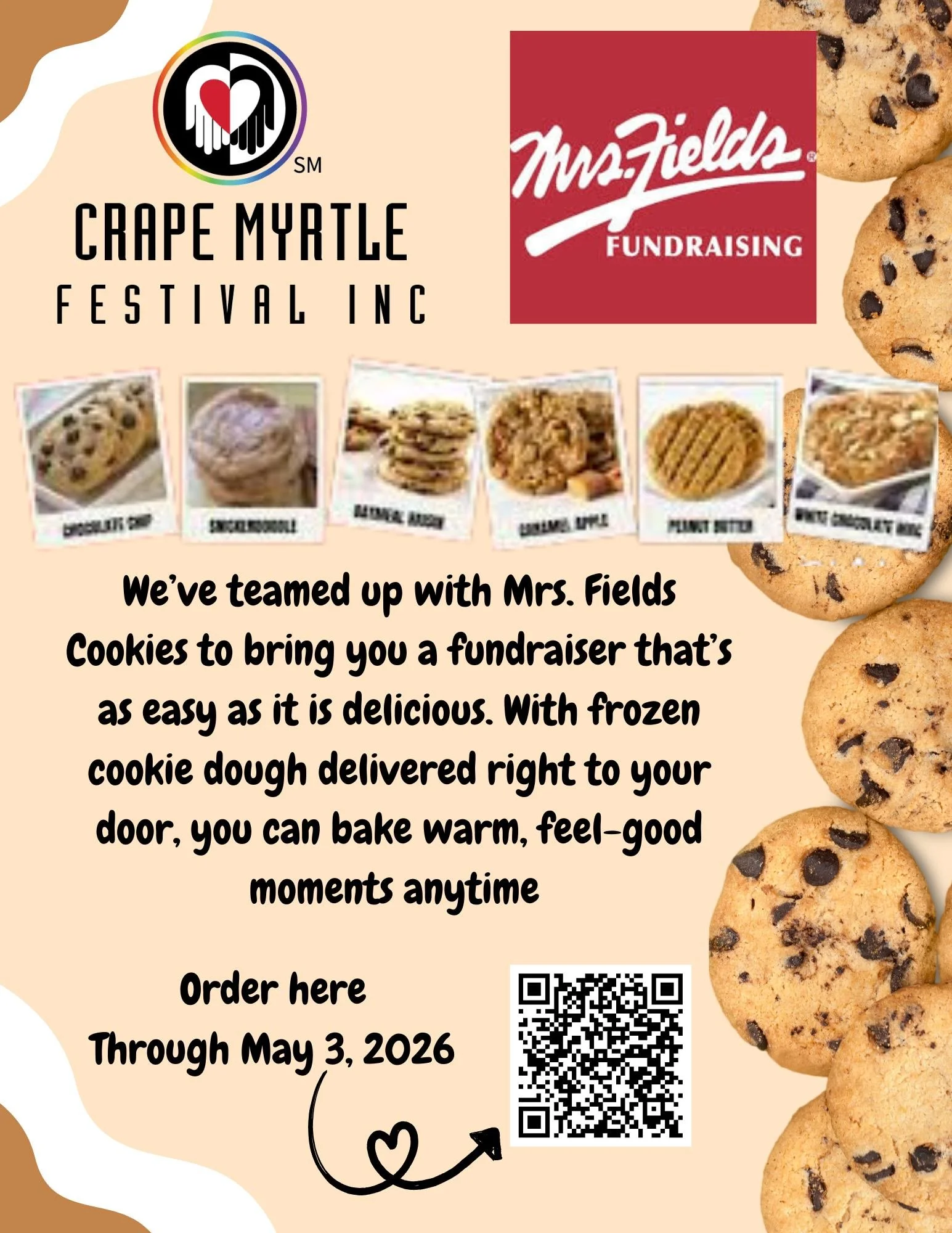 Crape Myrtle Festival has teamed up with @mrsfieldscookies to bring you the ultimate treat — frozen cookie dough delivered right to your door. Fresh-baked, warm, and ready whenever you are!