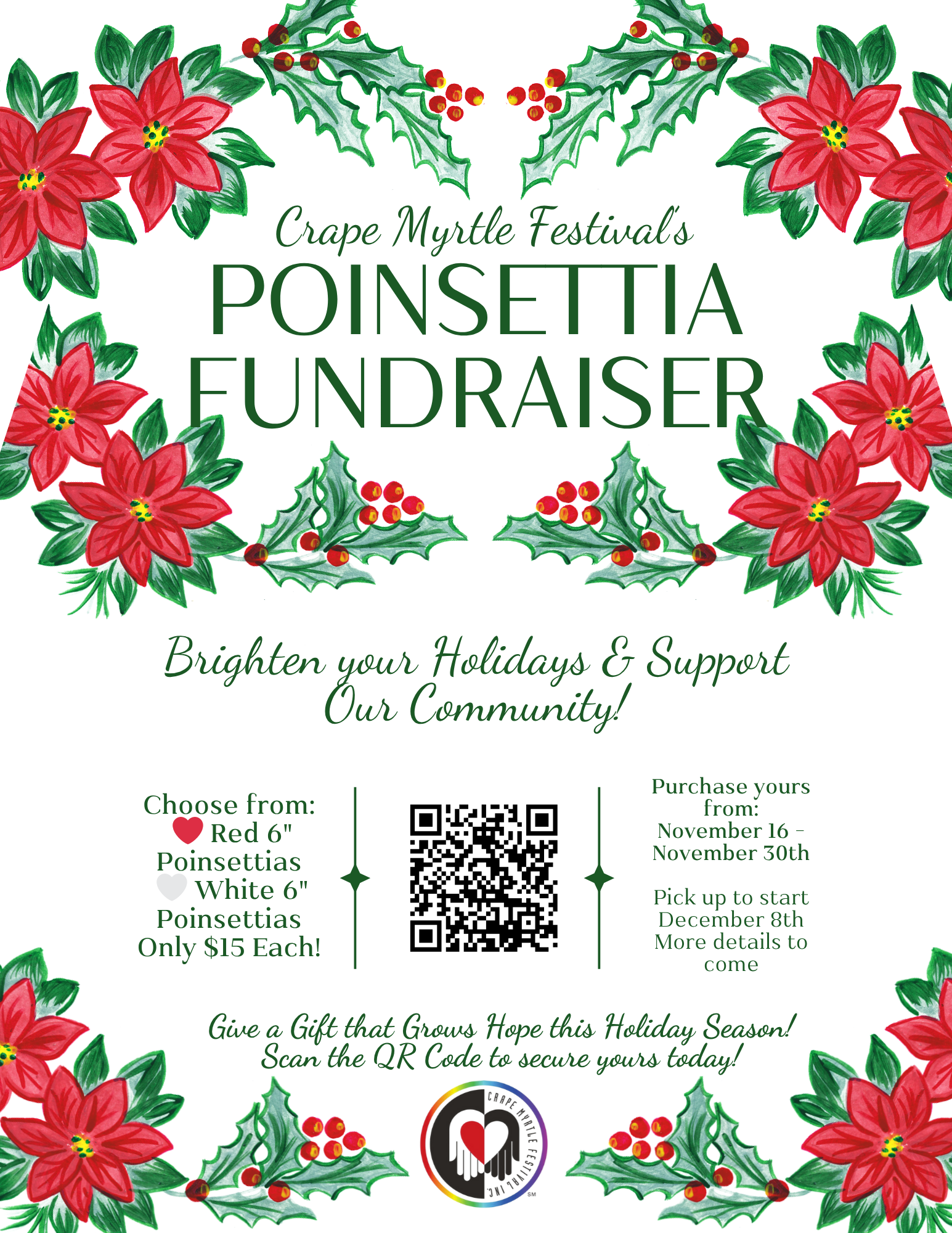 These gorgeous holiday plants make perfect gifts, décor pieces, or office additions—and every purchase helps support Crape Myrtle Festival’s mission of giving back to our community.